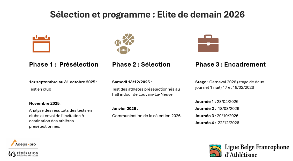 3. Phase « Encadrement » : les résultats de la phase « sélection » permettront de déterminer une sélection d’athlètes à hauts potentiels. Ceux-ci, seront invités par la Direction Technique, à un premier stage encadré par des entraineurs référents de la LBFA, du 17 au 18 février 2026, au hall d’athlétisme de Louvain-la-Neuve. Ils seront ensuite intégrés aux Elites de demain.