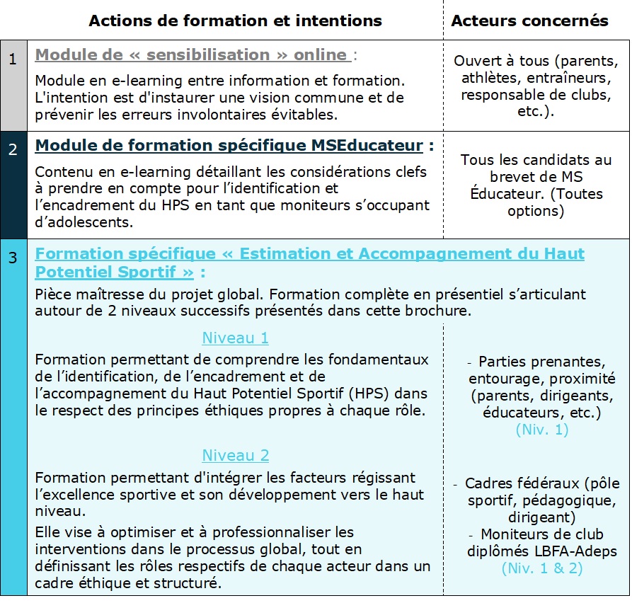 La LBFA, s’appuyant sur les aides et le cadre définis par la Fédération Wallonie-Bruxelles en 2021, s'inscrit dans cette dynamique pour étendre ses actions de « détection » et surtout augmenter l’expertise de l’encadrement de ses athlètes. Pour ce faire, elle déploie des actions de formations spécifiques destinées aux différents acteurs selon le plan suivant :